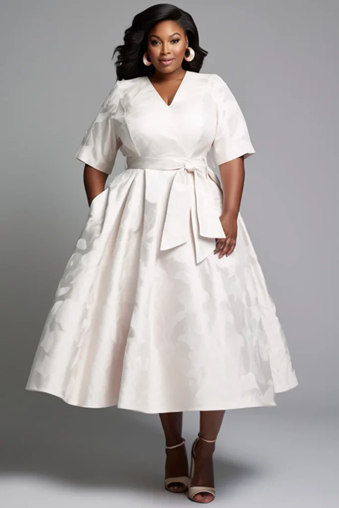 6. Romantic Jacquard: V-Neck Midi Wedding Dress with Belt Tie